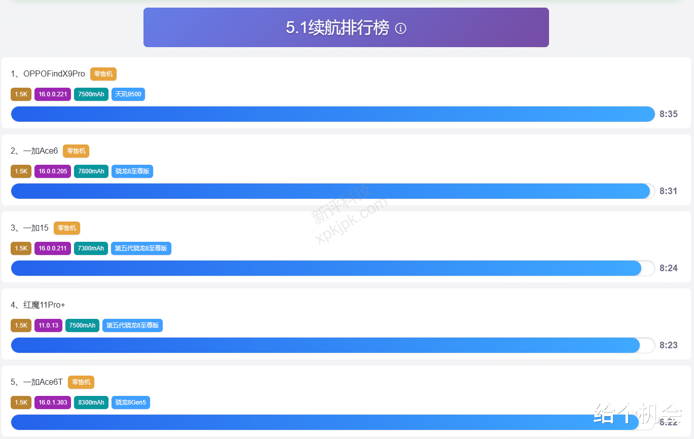 我们可以去看看新评科技5.1续航测试榜单,测试条件就是重度使用,其中包括微信语音通话、刷视频、刷微博甚至是玩游戏,这样重度使用续航最强的手机也才坚持八个多小时,虽然比起之前提升了不少,但重度用还是不够一天。
