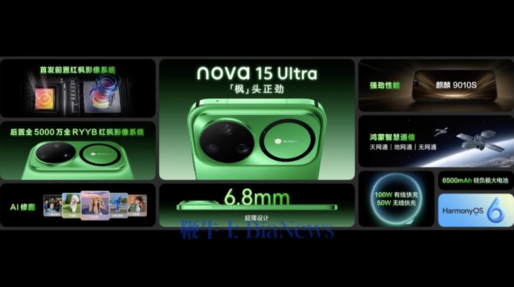 影像方面,作为nova15系列的最强版本,华为nova15Ultra首发全5000万双红枫影像系统。该机前置和后置都配备红枫镜头,其中前摄影像还首发像素级光谱感知算法,人物和景色均能精准还原色彩。