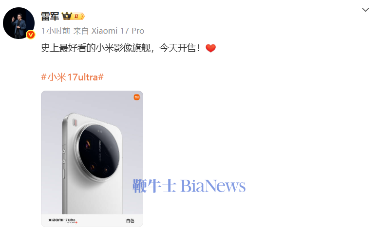 12月27日,小米17Ultra今天开售,小米创办人,董事长兼CEO雷军发文表示:“史上最好看的小米影像旗舰,今天开售”。