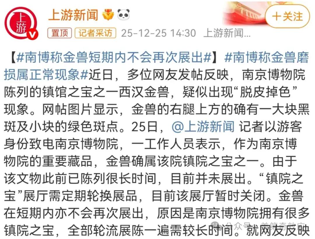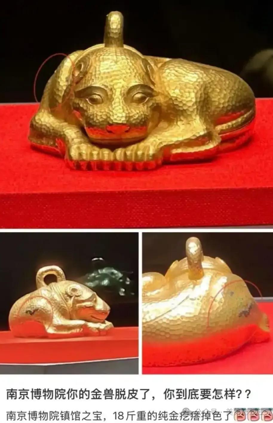 再比如南博的镇馆之宝,18斤的99足金的西汉金兽,竟然脱皮了…