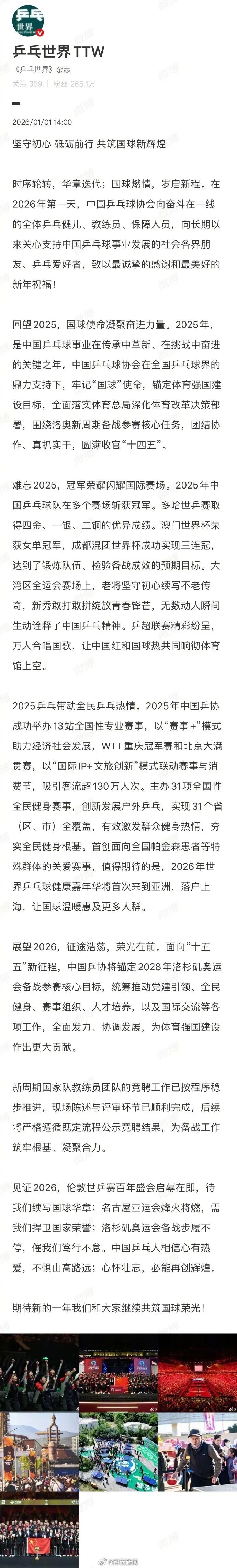 1月1日,据@乒乓世界TTW:中国乒协发长文回顾2025、展望2026,文中提到2026年世界乒乓球健康嘉年华将首次来到亚洲,落户上海,让国球温暖惠及更多人群。