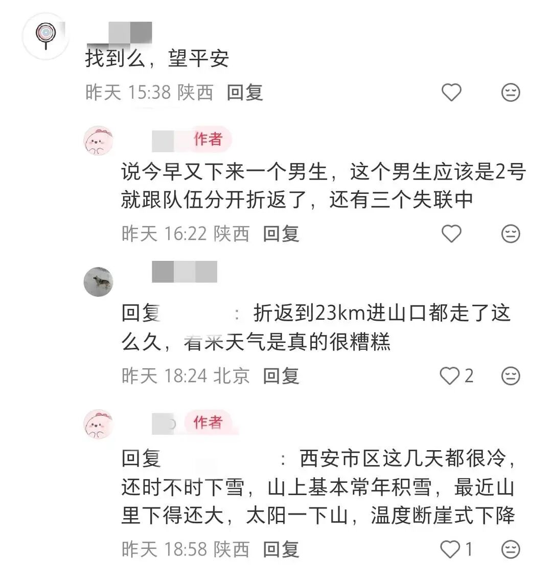 1月5日,一位当地驴友透露,4日早上又有一名驴友成功下山。截至目前,仍有三人处于失联状态。目前,救援队正在持续进行搜救。