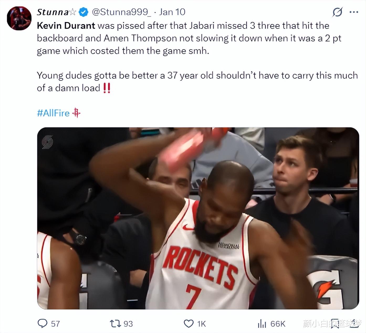 在火箭二连败开拓者后球队陷入了一片死寂,而且在第二场最后时刻杜兰特非常气愤直接在场边砸了水杯,杜兰特吞下了他超越张伯伦得分的