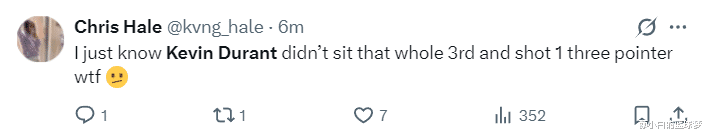 第三节杜兰特还是打无球,他本人要球的欲望也不高,感觉杜兰特对火箭的竞争性略显失望,单节10分钟只有2次出手单节拿到3分2助攻,而申京单节出手8次只命中2个,杜兰特三节15分5助攻4篮板。火箭球迷:我不理解,第三节为什么KD只有一个出手。