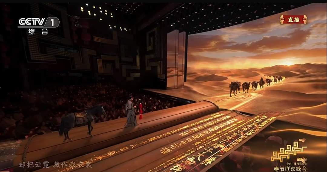 在歌咏创意秀《贺花神》、舞蹈《丝路古韵》中,演员穿梭于跨越古今的时空场景,呈现出震撼的互动奇观。这背后,是总台“央视听媒体大模型2.0”的首次大规模春晚应用。