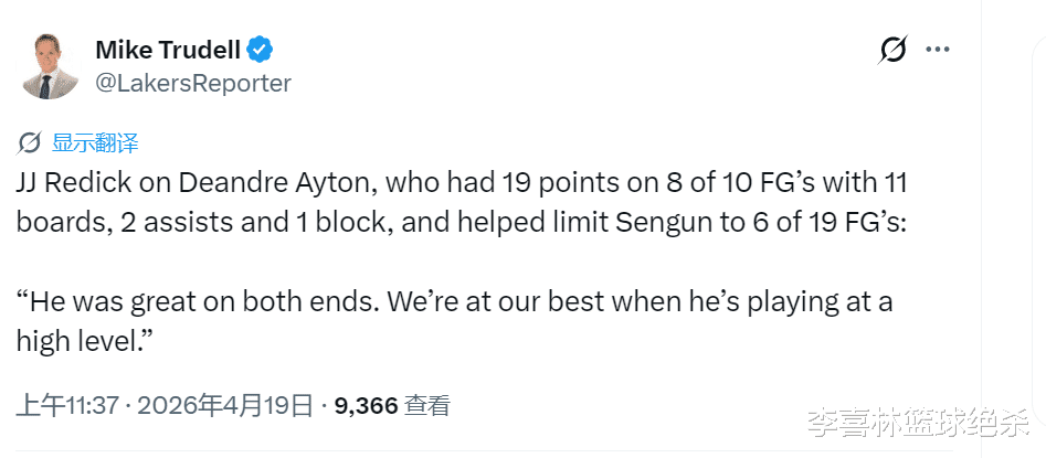 “他在攻防两端都打得很棒,他以高水平打球时,我们就处于最强形态。”在首战击败火箭后,湖人主帅雷迪克这样称赞艾顿。