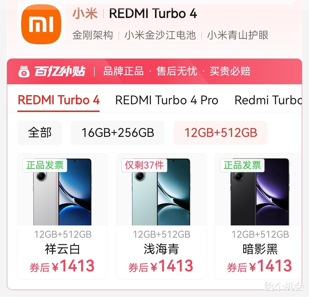 红米Turbo 4当初定价1999元起,现在出现了大跳水,12G+512G跌至1413元,这价格比一加ace 5竞速版更便宜,是目前千元档很值得考虑的机型。