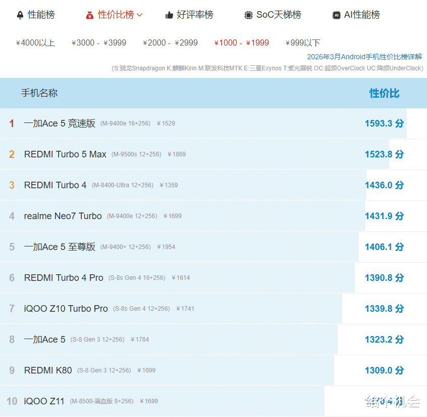 目前要是想买一部性价比高的千元512G手机,也确实只有老款更值得考虑,在安兔兔最新一期性能排行榜中,1000元档位性价比排前五的机型基本上都是去年的老款,按照排名依次是一加ace 5竞速版、红米Turbo 5 max、红米Turbo 4、真我neo 7 Turbo、一加ace 5至尊版,其中红米Turbo 5 max本身定价就是2000元档,现在还涨价了,而一加ace 5竞速版外围又很普通,综合来看红米Turbo 4是最香的,尤其是降价后很值得入手。