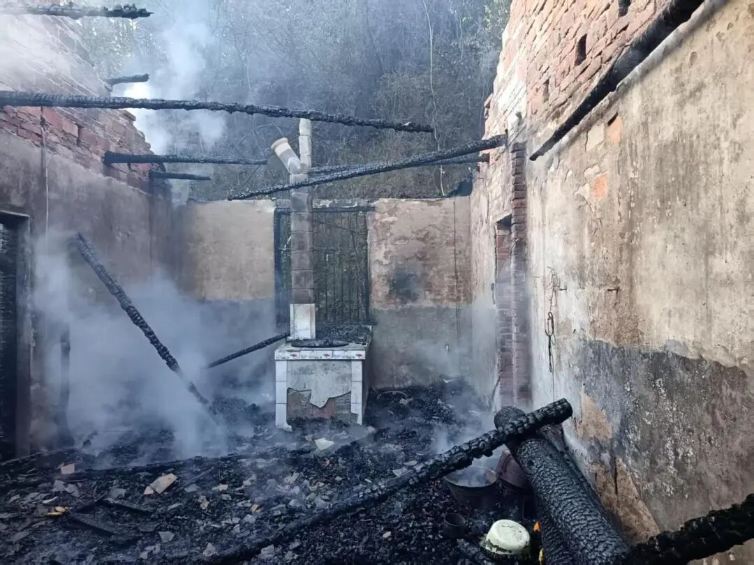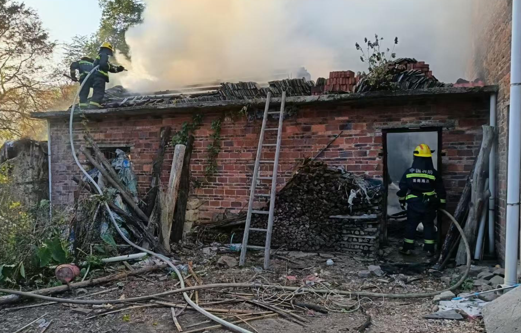 起火房屋厨房区域猛烈燃烧,滚滚浓烟裹挟着明火不断向外蹿出,房屋顶部瓦片已被全部烧毁,木质房梁随时有坍塌风险。