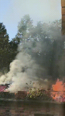 “我在家里闻到了一股烧焦的烟味,顺着味道走出来,看见他们家火光四射,喊门发现他家里一个人都没有,赶紧拨打119报警。”
