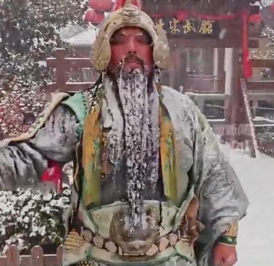 近日,一游客在河南开封万岁山武侠城游玩时,发现雪地里一座关羽的“冰雕”,走近才发现是一位正在表演站岗的NPC演员,看到身上都是雪、胡子上都是冰,不禁感叹“太敬业了”。