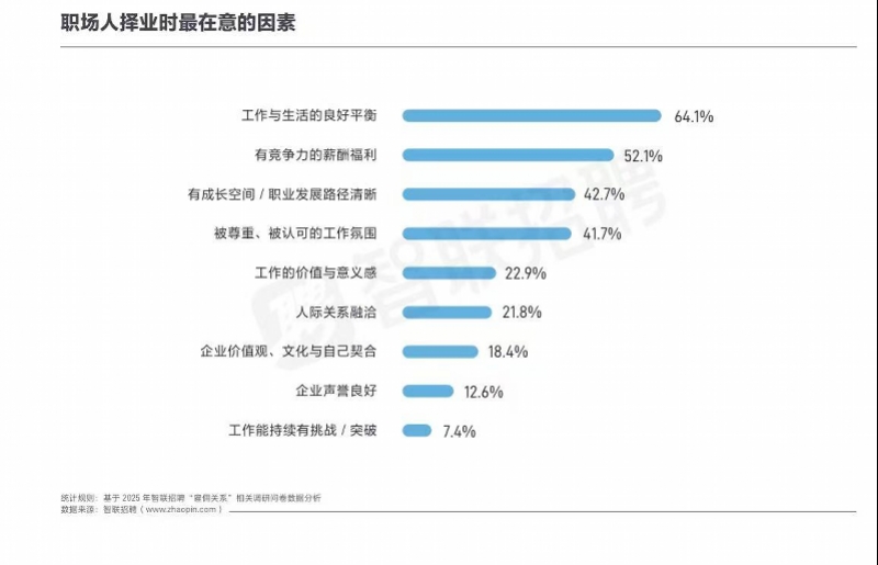 报告指出,工作与生活的良好平衡,成为64.1%的职场人首要选择,职场人如今更加关注工作能否保留充足的个人时间,不挤压生活空间,享有陪伴家人、发展兴趣与身心休憩的自由。同时,“有竞争力的薪酬福利”依然是职场人看重的因素,以52.1%的占比排列第二,其三是“有成长空间/职业发展路径清晰”,占比42.7%;“被尊重、被认可的工作氛围”以41.7%的占比紧随其后。