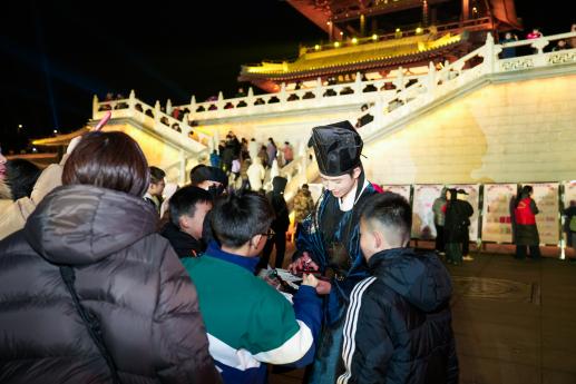 还有贯穿全场的《江州游历帖》集章打卡活动,更是巧妙地将非遗体验、美陈打卡与趣味互动任务相结合。游客通过完成非遗体验、与身着古装的“李白”“白居易”NPC对诗互动等方式收集贴印,最终可兑换具有九江特色的文创礼品或参与零点祈愿仪式的电子孔明灯。这套“探索-互动-奖励”的玩法,极大地增强了活动的趣味性与参与者的获得感,实现“非遗可触、文化可玩”。