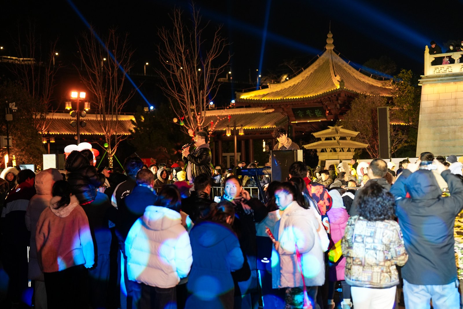 晚间10点,细雨不期而至,却未打断活动节奏。主办方迅速分发雨具、调整露天演出动线,游客们亦从容撑伞,继续沉浸在欢乐氛围中。临近零点,灯光秀亮度渐强,雨丝在光束中闪烁如银线,成为天然的舞台背景。当全场万人齐声倒计时——“10、9、8……”,声浪穿透雨幕,愈发整齐洪亮;直至“新年快乐”的欢呼爆发,素不相识的游客在伞下相视而笑,彼此祝福。