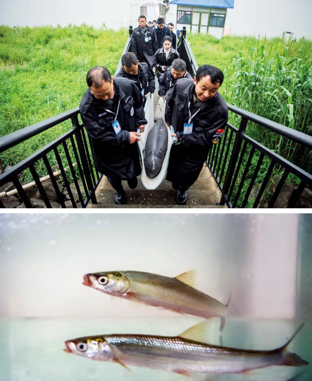 上图:2023年4月25日,来自长江天鹅洲故道的4头迁地保护长江江豚,被分批顺利放归进入长江干流新螺段和石首江段。