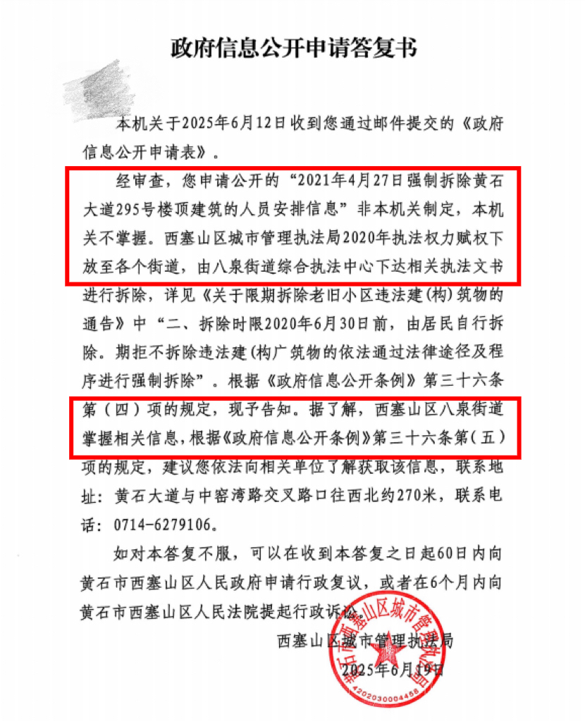 2025年6月19日,西塞山区城管局对其答复称,该机关不掌握该信息,西塞山区八泉街道掌握相关信息。答复中介绍,西塞山区城管局2020年将执法权力赋权下放至各个街道,由八泉街道综合执法中心下达相关执法文书进行拆除。