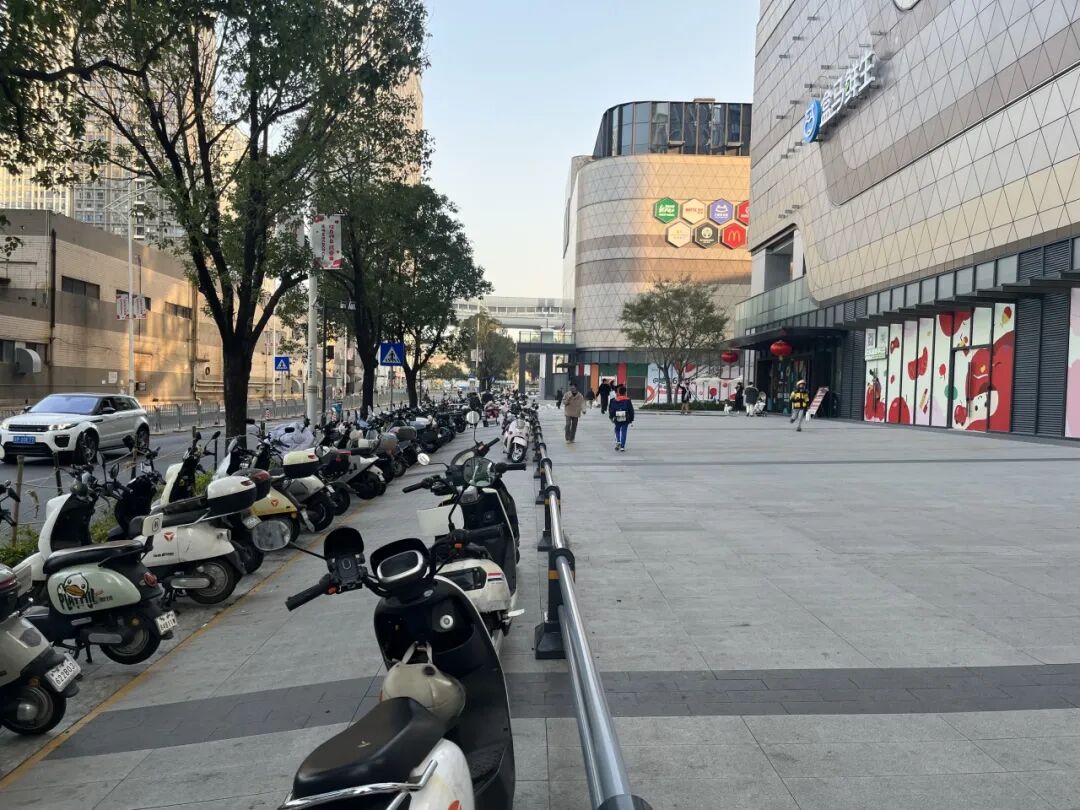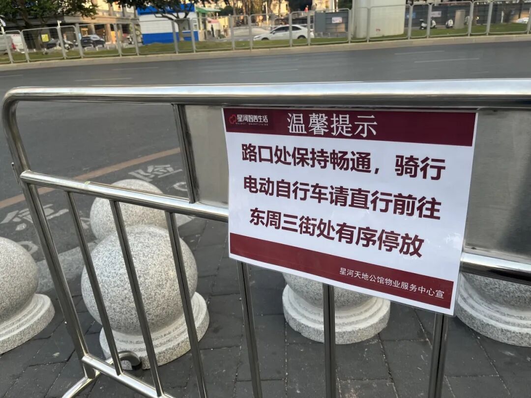 在星河COCOCityA馆外围靠近光明大道处,管理方已用石墩围出专门区域供非机动车停放,并设有相关引导牌提示市民前往指定停车点,现场停放秩序总体良好。