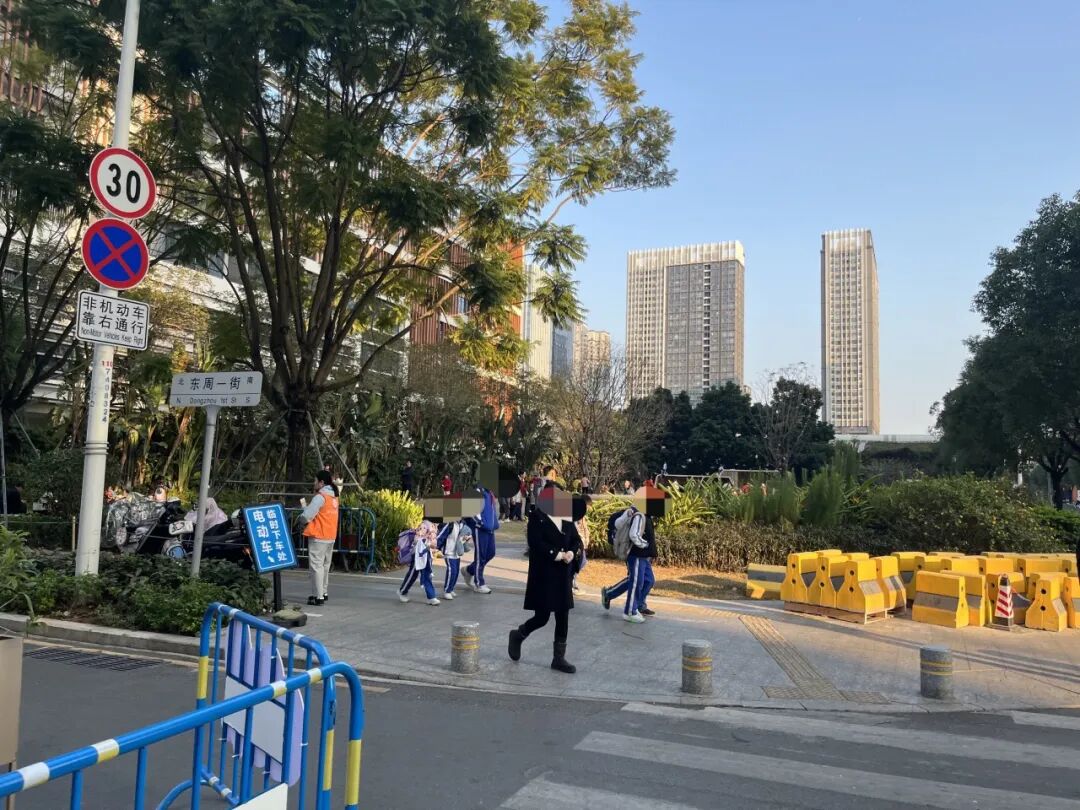 此外,记者现场观察到东周一街靠近星河小学路段目前已设置围栏,机动车禁入,并有交警与执法人员巡逻指挥,提升了学生通行安全。