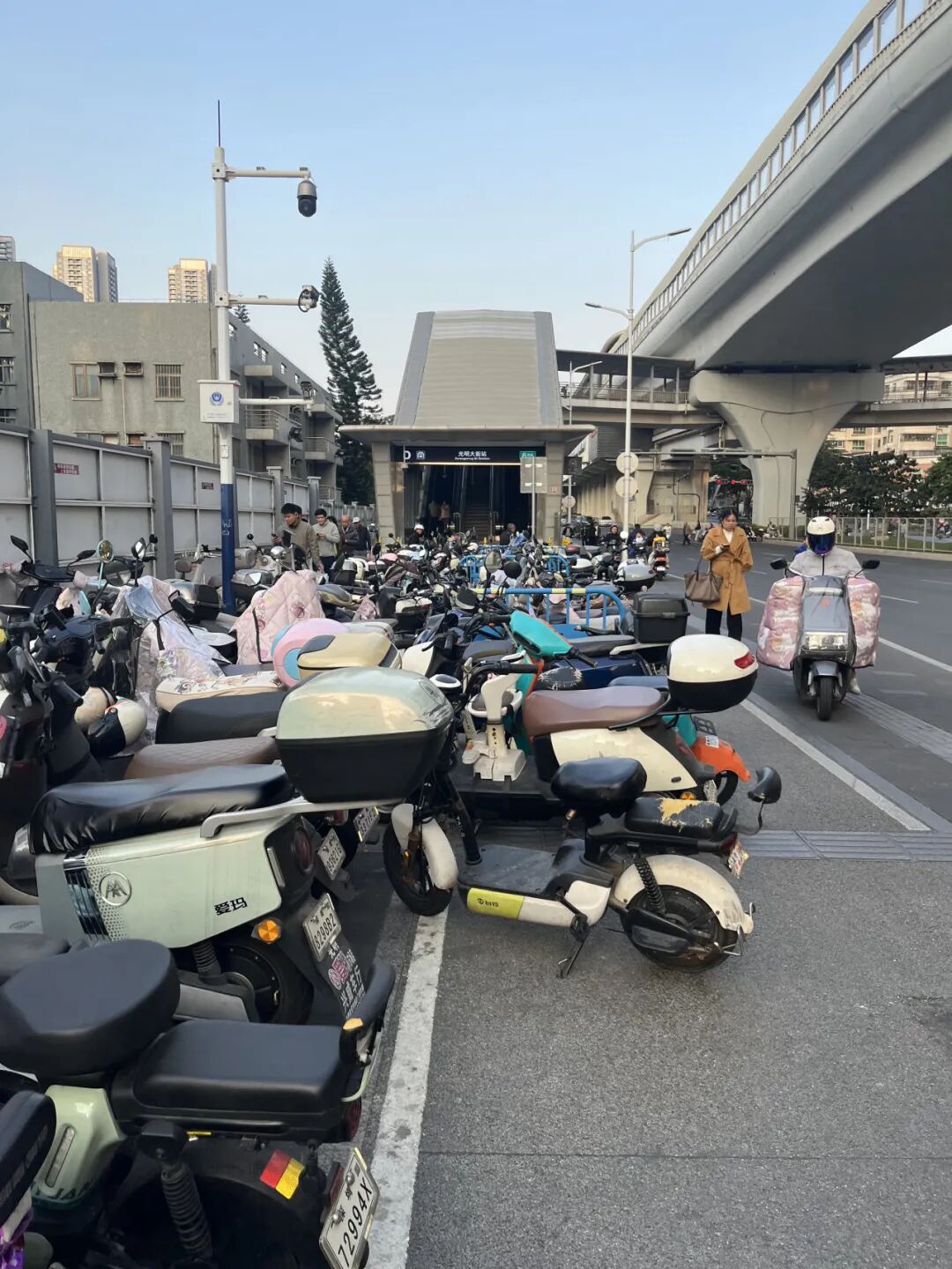 尽管附近墙面设有“非机动车停车区规范停放”的提示牌,但现场并未设置足够的合规停放区域。桥下空间及地铁出口处,车辆停放依旧杂乱无序。