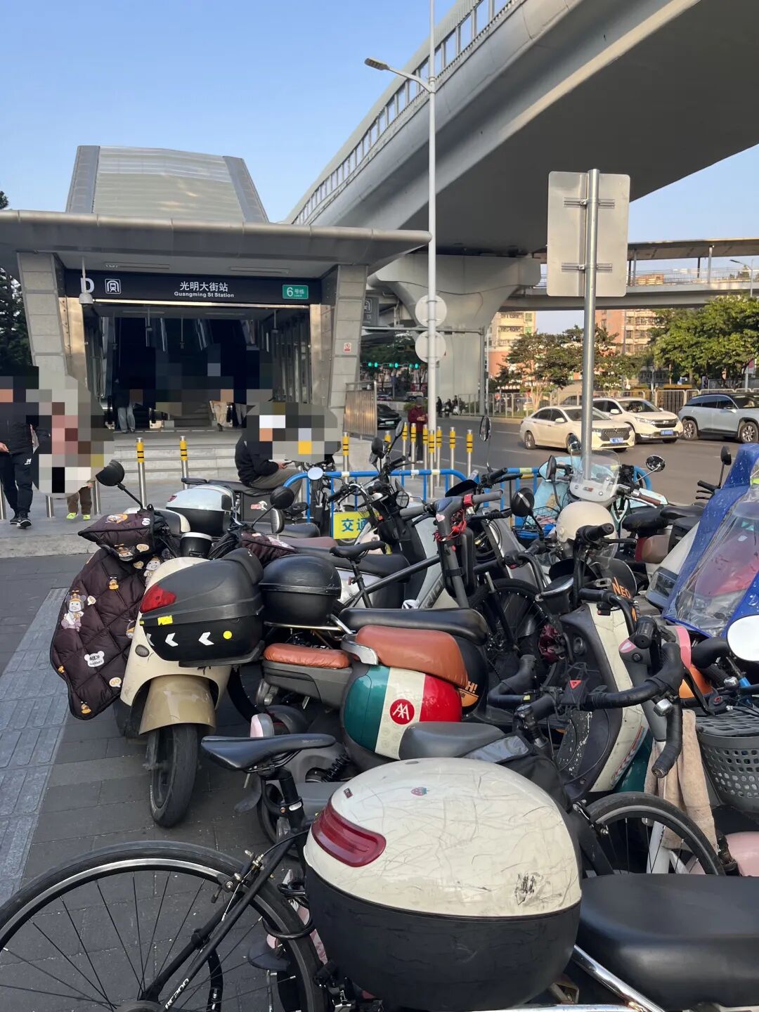 首先,地铁光明大街站D出口外人行道仍被大量电动自行车占据,仅留狭窄通道供行人通行,记者在现场未见志愿者引导,也缺少清晰的停车标线。