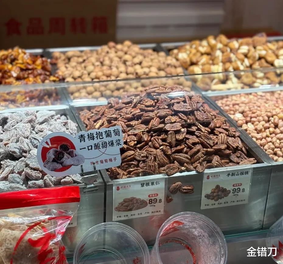 这两年跟风入局进入商场的炒货品牌欢喜花生,碧根果仁89.9元/500g、山核桃99.8元/500g、价签上的数字看得人眼花缭乱。