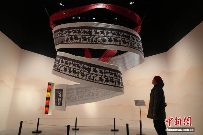 2月19日,安徽博物院展出的以汉代车马出行拓片图为核心创作的艺术装置。中新社记者张俊摄