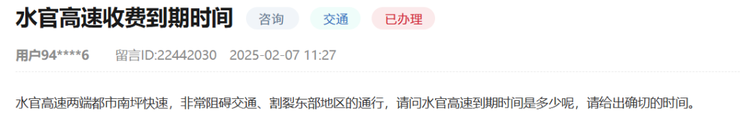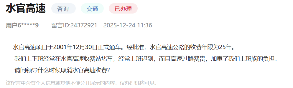 奥一新闻记者梳理发现,仅2025年12月,即有两位市民在人民网“领导留言板”留言询问水官高速取消收费的具体时间。相关留言虽获部门电话回复,但结果并未公开。