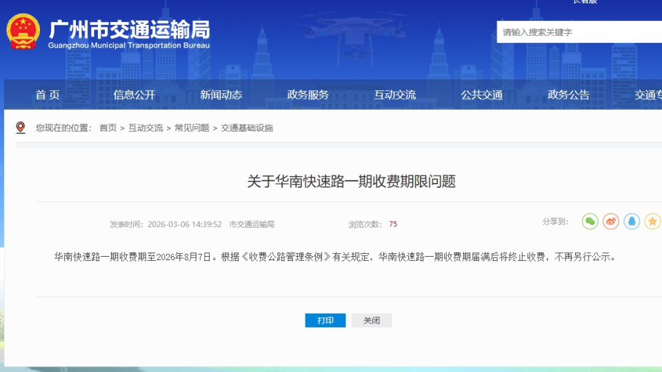近日,广州市交通运输局宣布华南快速路一期收费期至2026年8月7日届满并将终止收费。