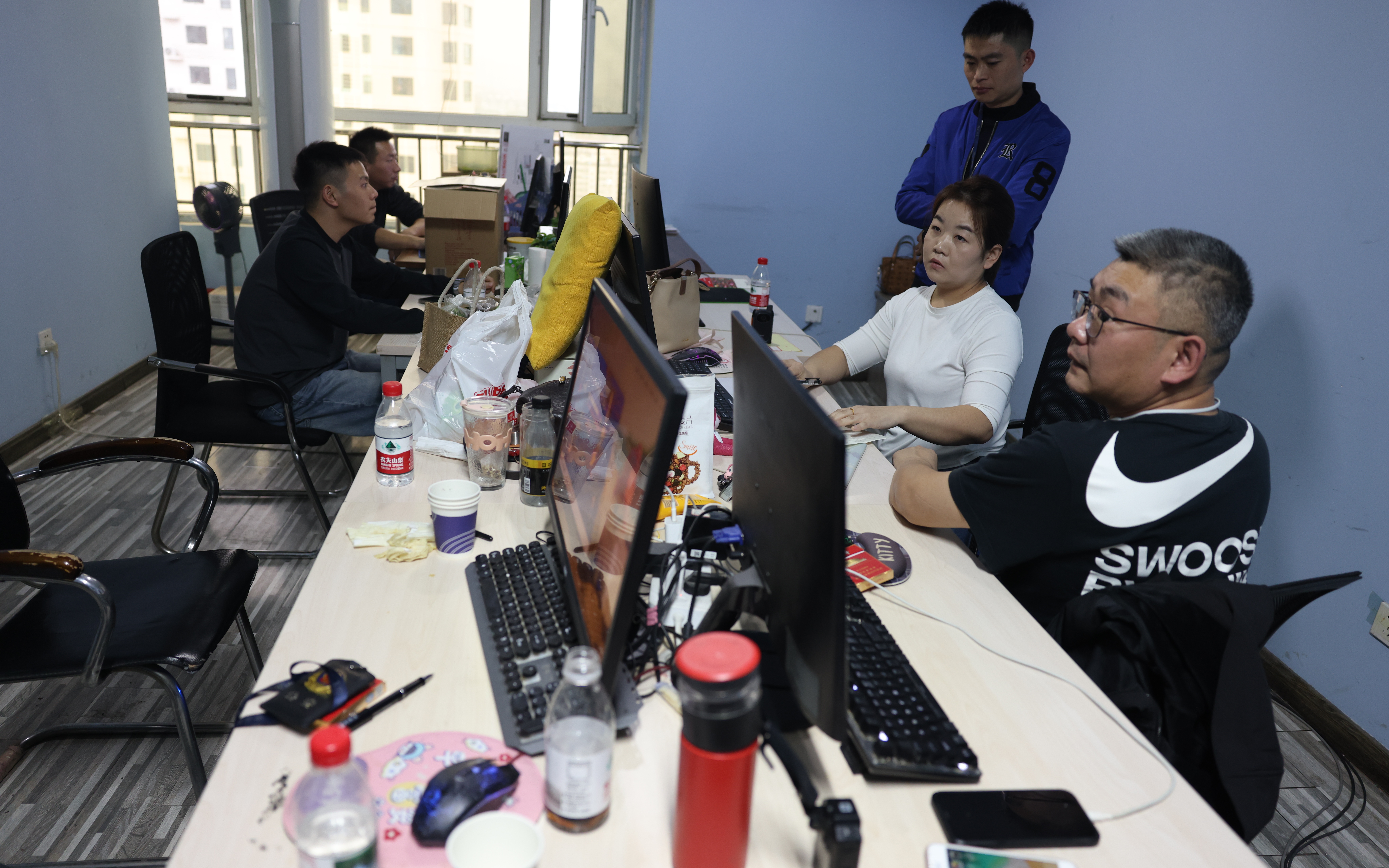 该营销点位于一幢三室二厅的小区单元房里,客厅四张桌子相连,桌面摆放着8台电脑,一间房子被装修成直播录制室。
