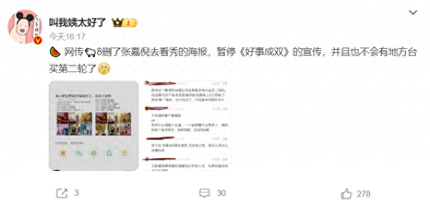 此外,还有大V爆料称以后不会再有电视台购买《好事成双》这部剧进行第二轮播出。
