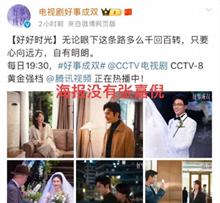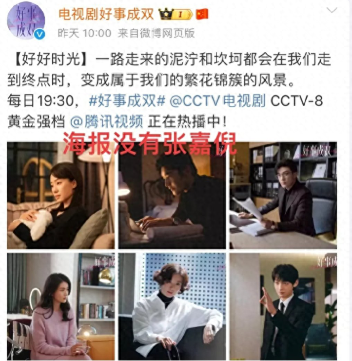 如今,在《好事成双》最新的宣传海报中,已经没有了张嘉倪的身影。甚至剧中其他主角和配角都有单人海报露出,但是张嘉倪没有。