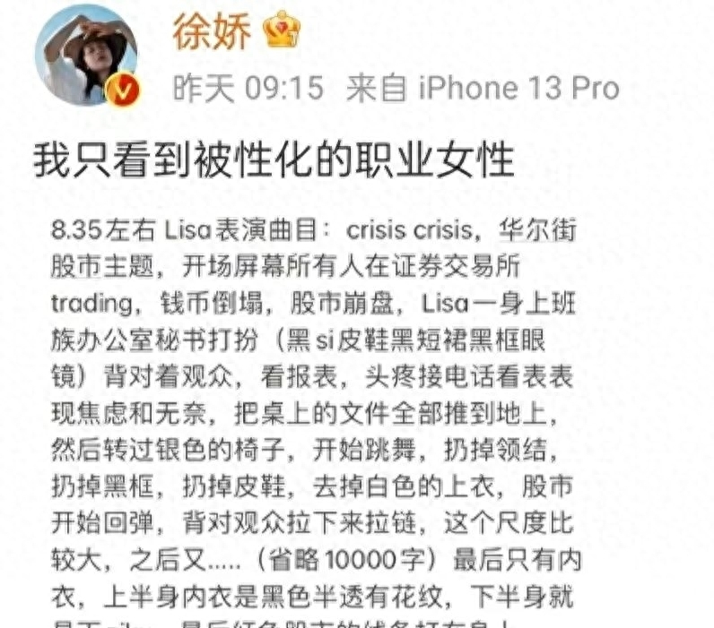 在Lisa完成表演之后,女星徐娇更是勇敢发言称“我只看到了被性化的职业女性。”