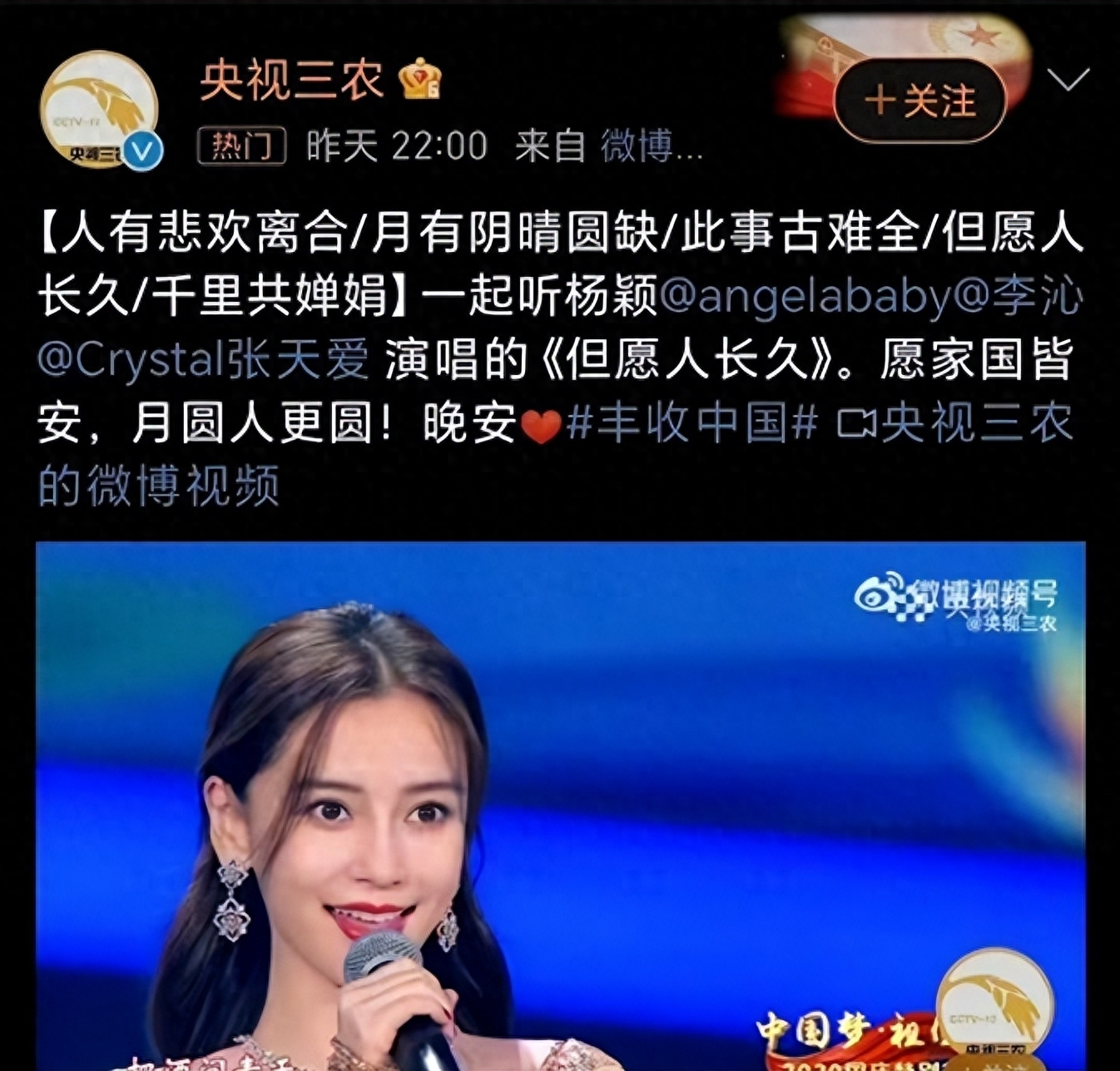 有网友发现,原先央视三农官方账号发布了一条有关杨颖的中秋视频,但随着她去看疯马秀,央视三农已经删除了该视频。