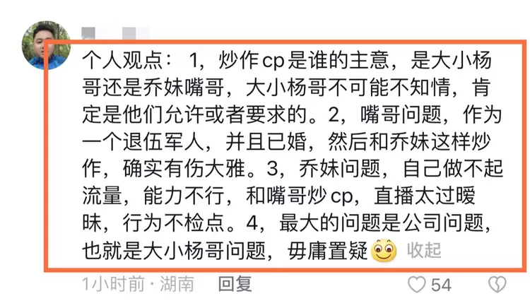 近段时间,小杨哥徒弟乔妹与嘴哥的CP风波闹得越来越严重,直到11月6号,嘴哥才正式回应两人的关系,一句“直播间所有配合纯属娱乐,只为大家开心一笑”让很多网友破防,原来一切都是“我们”一厢情愿。