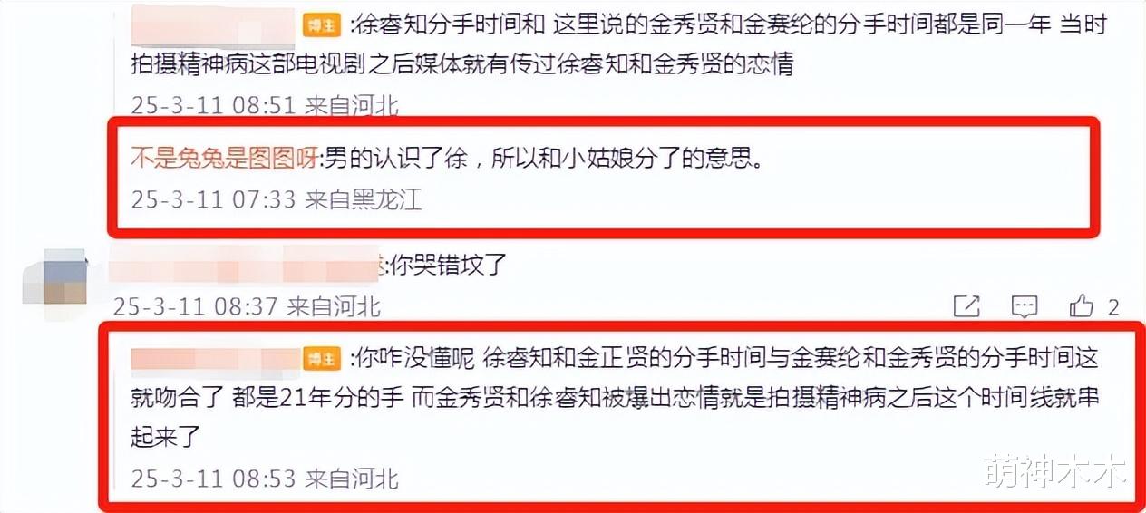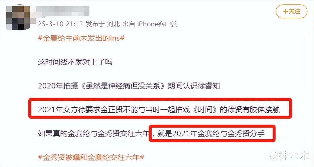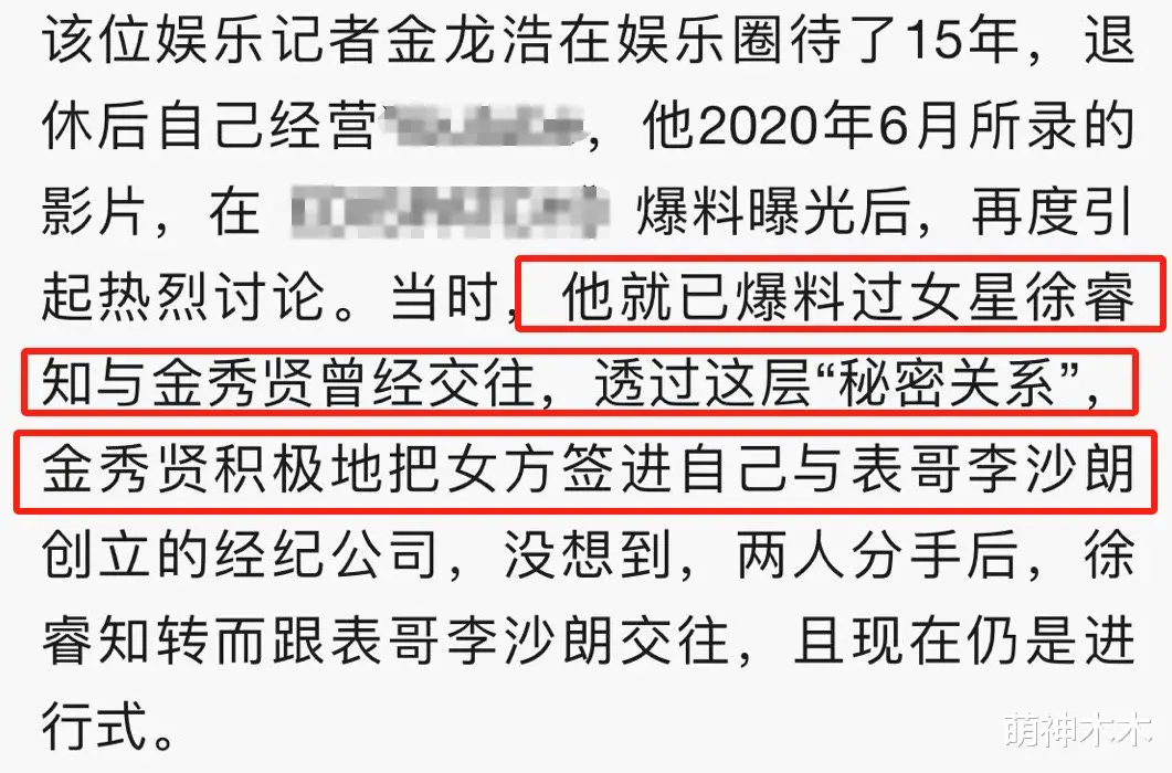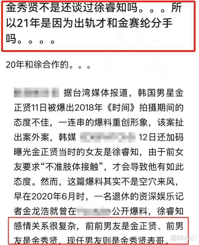 先等一等,大家有没有发现一丝巧合,徐睿知当年也算一剧成名,结果却突然被曝出让前男友金正贤孤立徐贤,正是因为闹出了恋情绯闻也遭到网暴,口碑低落谷底最终离开公司。就在这期间,徐睿知被曝出和金秀贤以及金秀贤表哥交往过,同样男方也是否认,同样也是女方打碎了牙往肚子里吞,不同的是金赛纶绷不住离世了,而徐睿知直到近一年才慢慢开始拍戏。