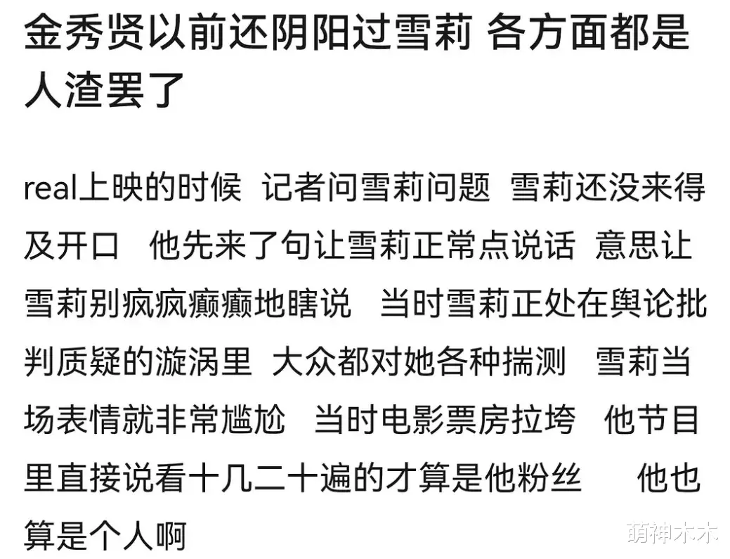 风波愈演愈烈,甚至连离世多年的女星雪莉也被牵扯了进来,当初金秀贤成功劝说雪莉加盟自己退伍后首部电影,但从拍摄到上映,营销最多的话题就是雪莉的大尺度镜头,乃至于在电影扑了之后,雪莉被骂得更惨。