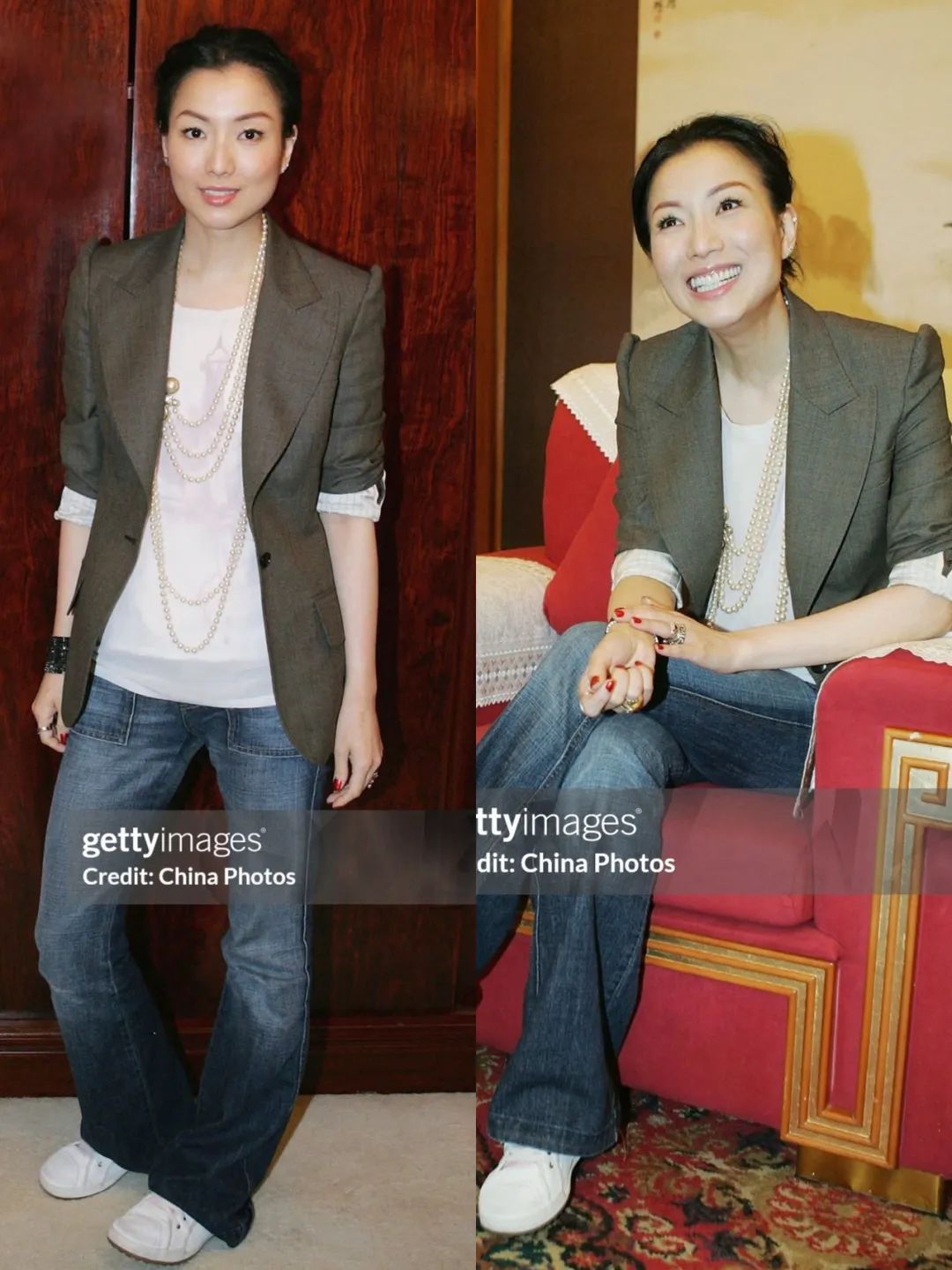 年轻时也有穿职场装,比如灰色西装,内搭白色T恤,搭配牛仔裤和小白鞋,现在看起来依然流行!她搭配了珍珠长项链,洋气又高级!