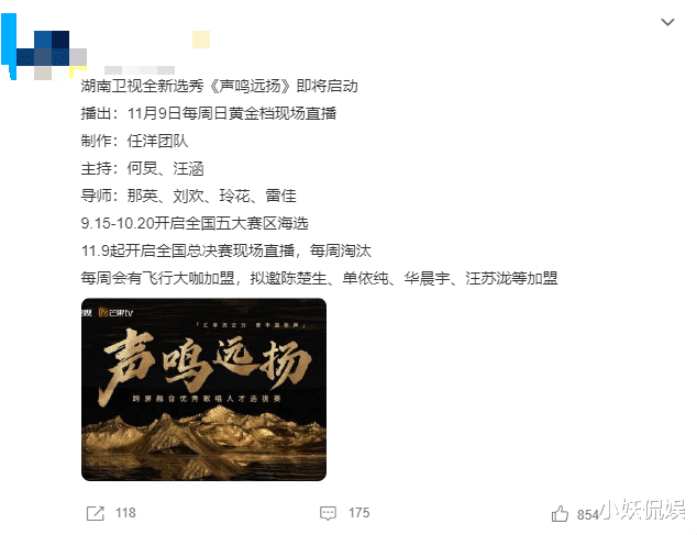 还节目将于9月中旬至10月中旬开启全国五大赛区海选,11月9日开始全国总决赛,每周会进行淘汰赛,该节目的主持人则是湖南卫视的台柱子何炅和汪涵。