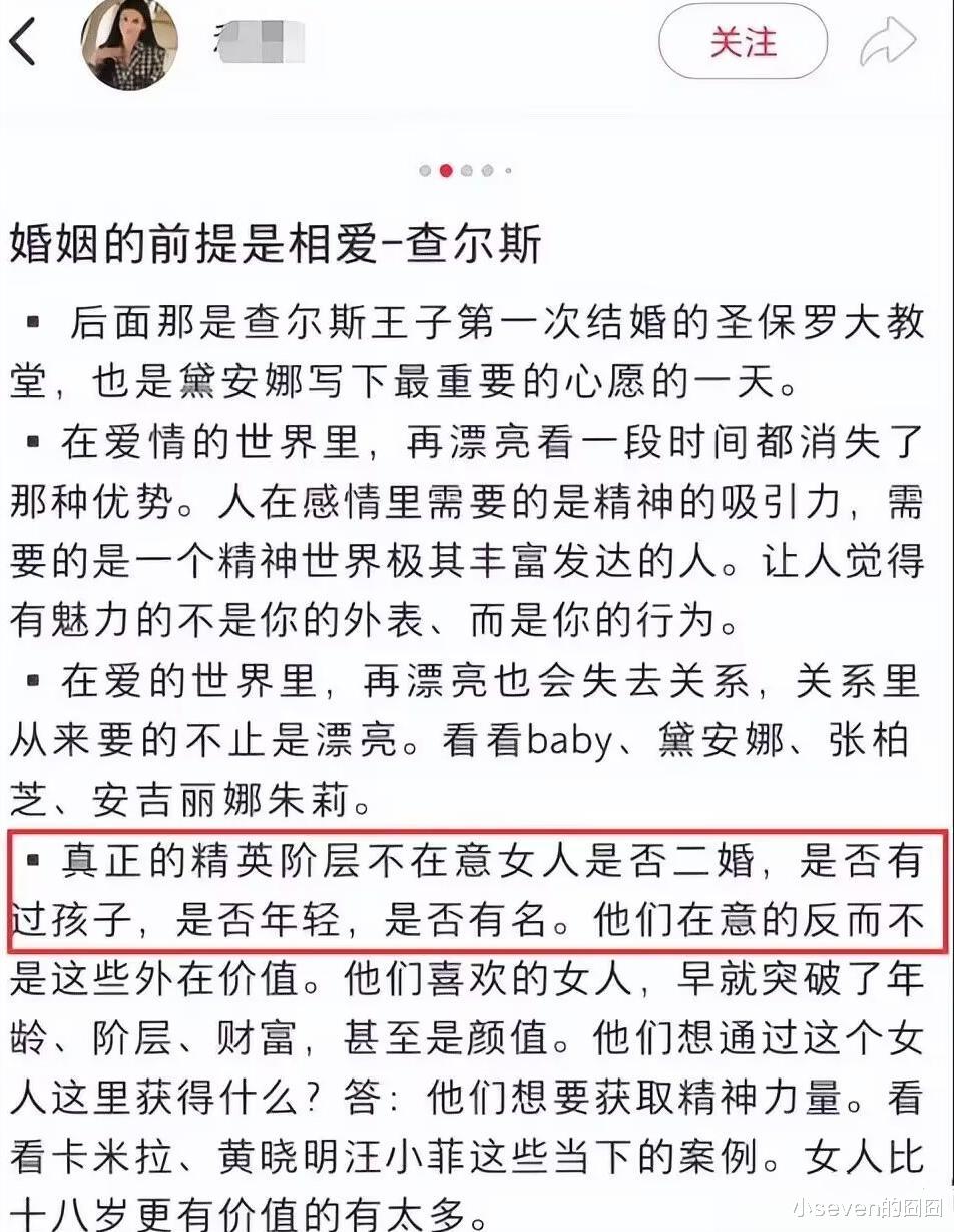 而这位女孩也曾在社交账号上发布过文案,表达自己对查尔斯王子爱情的感慨,她称不在意二婚,也不在意对方是否有孩子。