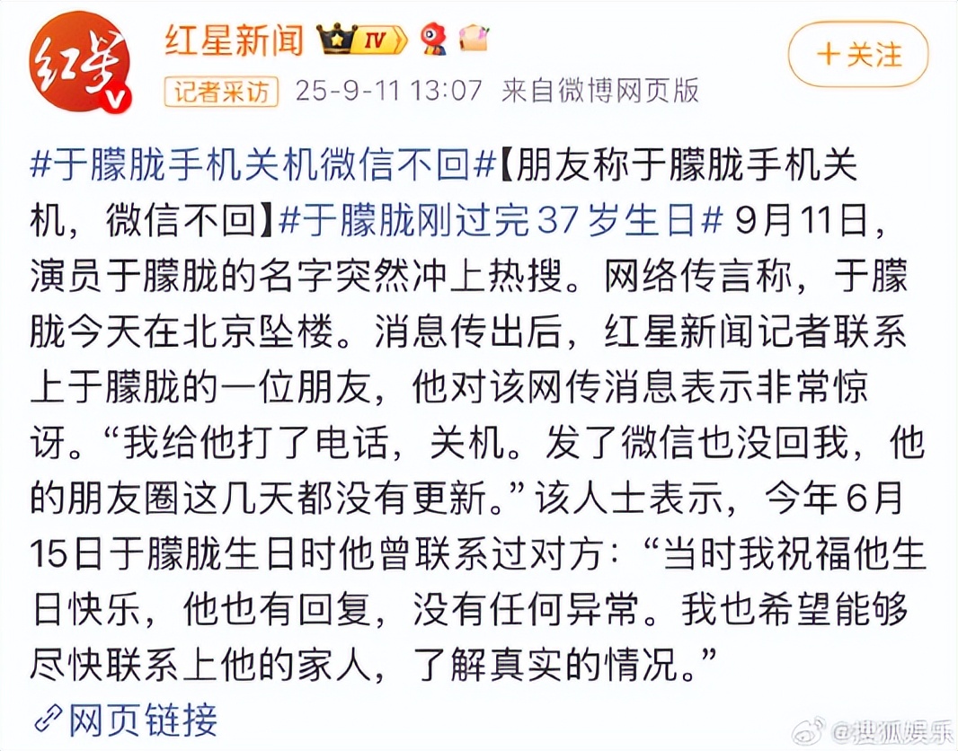 据红星新闻报道,于朦胧的朋友受访回应,对此十分惊讶,给于朦胧打电话,电话关机、微信没人回,朋友圈这几天没更新,在此之前,于朦胧没有任何异常。