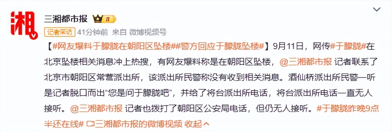 目前来看,警方已经关注到网传于朦胧坠楼身亡事件,另外一家媒体记者联系了于朦胧名下的关联的两家工作室,其中一家没听,另外一家则在拨通后挂断电话,网友喊话于朦胧工作室赶紧辟谣。