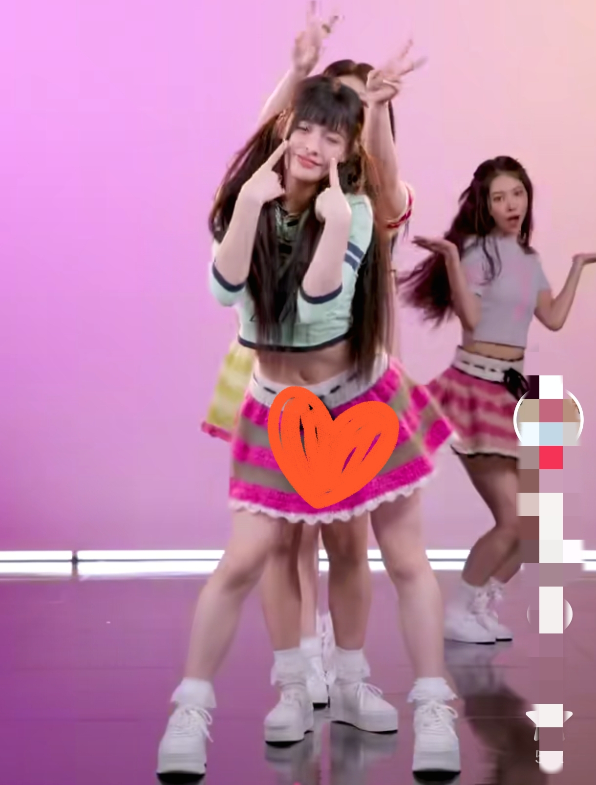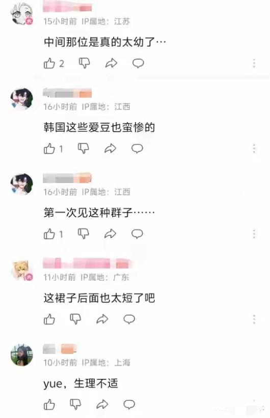 而最近看到她们女团的主打歌曲,不知道该公司的出于什么想法,安排女团舞蹈的服装上半身就是那种加长的短袖,很像学生的校园风格,给人的第一感觉就是她们还是小孩子;下半身就是那种有点童真的超短细纱纱裙,单看其实还是勉强还说得过去。但是当舞蹈强光一亮,那种细纱裙根本无处可躲,瞬间变成了较透明的裙子,遮不住,根本遮不住。